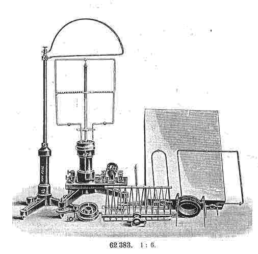 Az Ampére-féle állvány gyakorlatilag egy fényezett fatalpra szerelt és higanytartóval ellátott rézállványból áll. A két higanytartóba higanyt öntve azt biztosíthatjuk, hogy a különböző alakú drótkeretekben áram folyjon. A készlethez tartozik egy különálló fatalpra szerelt eltérítő szolenoid tekercs, amellyel mágneses mezőt tudunk előállítani, valamint egy-egy kör alakú és négyzet alakú drótkeret is. Tartozék még egy-egy olyan drótkeret is, amelyeken vízszintesen, illetve függőlegesen párhuzamos vezetők futnak, oly módon, hogy a két vezetékben ellentétes irányú áramok folynak. Az áramkör záródását és a viszonylag kis súrlódást a drótkeretekre helyezett tűhegyek biztosítják, így a drótkeretek szabadon foroghatnak a higany felszínén. |