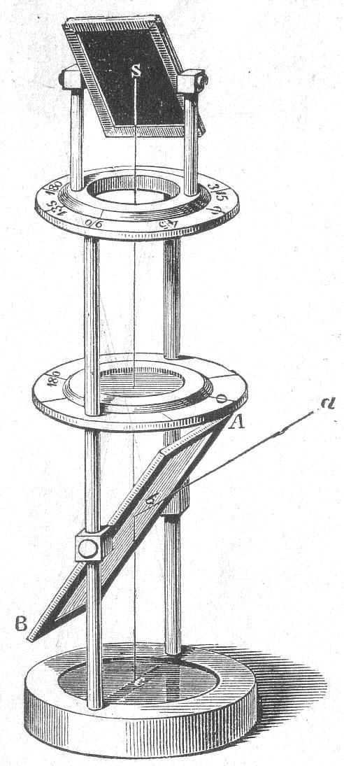 A teljesen polarizált átmenő fény kimutatására használható Nörrenberg-féle készülék működését könnyen megérthetjük a rajzok alapján. A középső rajzon látható AB polarizáló üveglapra eső ab fénysugár először a készülék alján található amalgámos c tükörre, s erről az elemző S tükörre esik. Ez utóbbi tükör fekete üvegből van, s vízszintes tengely körül forgatható. A tükör helyett kis fényáteresztő képességű, de polarizátorként és analizátorként is kiválóan alkalmazható turmalin lemezt vagy több egymásra helyezett üveglapot is használhatunk. Ehhez a sötétített tükör - a tartójával együtt- a készülék felső részéről leemelhető, s így a helyére az előbbi alkatrészek beilleszthetők. Az AB és S között levő és szintén eltávolítható kerek üvegasztalkára tehetjük azokat az átlátszó testeket, amelyeknek a polarizált fényben való magatartását szeretnénk megvizsgálni. |