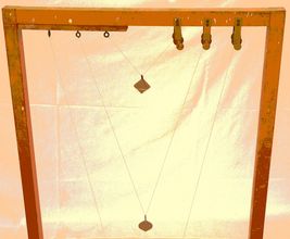 A szertárban található ingaállvány egy fából készült keret, amelyre három különböző hosszúságú matematikai inga van az ábra szerint felfüggesztve. Az ingákon a súlyok sárgarézből készült kettős kúpok. Az ingák hosszát a keret felső oldalán elhelyezett sárgarézből készült állító csavarokkal tetszőlegesen beállíthatjuk. |