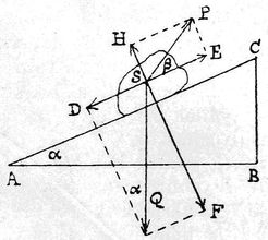 A lejtőre helyezett testre mindössze két erő hat: a gravitációs erő (Q) és a lejtő által a testre kifejtett felületi erő (P). Bontsuk fel mind a gravitációs erőt, mind a felületi erőt a lejtővel párhuzamos, illetve a lejtőre merőleges DS és FS, illetve ES és HS összetevőkre. Az FS erő a testet a lejtőre szorítja, de mozgást nem idéz elő. Ezzel az erővel azonos nagyságú, de ellentétes irányú erő a P erőnek a HS összetevője, az ún. nyomóerő.
